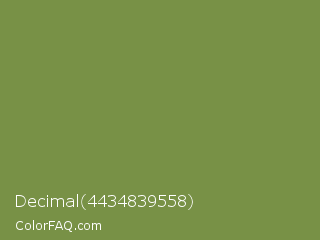 Decimal 4434839558 Color is a normal green color and the nearest color is Palm Leaf #6f9940. Hex code #789146 and RGB value is rgb(120,145,70). In RGB color space, this color is composed of 47% red, 57% green, 27% blue, In CMYK color space, this color is composed of 17% cyan, 0% magenta, 52% yellow , 43% black , In HSL color space, this color has a hue angle of 80° , 35% saturation and 42% lightness.