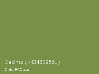 Decimal 4434839561 Color is a normal green color and the nearest color is Palm Leaf #6f9940. Hex code #789149 and RGB value is rgb(120,145,73). In RGB color space, this color is composed of 47% red, 57% green, 29% blue, In CMYK color space, this color is composed of 17% cyan, 0% magenta, 50% yellow , 43% black , In HSL color space, this color has a hue angle of 81° , 33% saturation and 43% lightness.