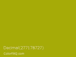 Decimal 277178727 Color is a normal yellow color and the nearest color is Sahara #b7a214. Hex code #a5aa07 and RGB value is rgb(165,170,7). In RGB color space, this color is composed of 65% red, 67% green, 3% blue, In CMYK color space, this color is composed of 3% cyan, 0% magenta, 96% yellow , 33% black , In HSL color space, this color has a hue angle of 62° , 92% saturation and 35% lightness.