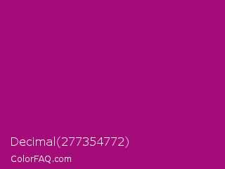 Decimal 277354772 Color is a normal magenta color and the nearest color is Flirt #a2006d. Hex code #a60b7a and RGB value is rgb(166,11,122). In RGB color space, this color is composed of 65% red, 4% green, 48% blue, In CMYK color space, this color is composed of 0% cyan, 93% magenta, 27% yellow , 35% black , In HSL color space, this color has a hue angle of 317° , 88% saturation and 35% lightness.