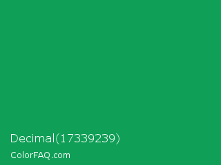 Decimal 17339239 Color is a normal green color and the nearest color is Shamrock Green #009e60. Hex code #109f57 and RGB value is rgb(16,159,87). In RGB color space, this color is composed of 6% red, 62% green, 34% blue, In CMYK color space, this color is composed of 90% cyan, 0% magenta, 45% yellow , 38% black , In HSL color space, this color has a hue angle of 150° , 82% saturation and 34% lightness.