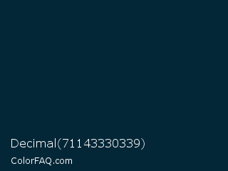 Decimal 71143330339 Color is a very dark blue color and the nearest color is Daintree #012731. Hex code #042737 and RGB value is rgb(4,39,55). In RGB color space, this color is composed of 2% red, 15% green, 22% blue, In CMYK color space, this color is composed of 93% cyan, 29% magenta, 0% yellow , 78% black , In HSL color space, this color has a hue angle of 199° , 86% saturation and 12% lightness.