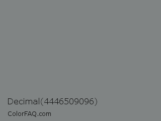Decimal 4446509096 Color is a normal cyan color and the nearest color is Gunsmoke #828685. Hex code #808484 and RGB value is rgb(128,132,132). In RGB color space, this color is composed of 50% red, 52% green, 52% blue, In CMYK color space, this color is composed of 3% cyan, 0% magenta, 0% yellow , 48% black , In HSL color space, this color has a hue angle of 180° , 2% saturation and 51% lightness.