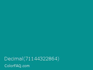 Decimal 71144322864 Color is a dark cyan color and the nearest color is Viridian Green #009698. Hex code #059092 and RGB value is rgb(5,144,146). In RGB color space, this color is composed of 2% red, 56% green, 57% blue, In CMYK color space, this color is composed of 97% cyan, 1% magenta, 0% yellow , 43% black , In HSL color space, this color has a hue angle of 181° , 93% saturation and 30% lightness.