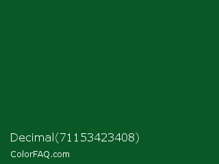 Decimal 71153423408 Color is a very dark green color and the nearest color is Camarone #00581a. Hex code #095826 and RGB value is rgb(9,88,38). In RGB color space, this color is composed of 4% red, 35% green, 15% blue, In CMYK color space, this color is composed of 90% cyan, 0% magenta, 57% yellow , 65% black , In HSL color space, this color has a hue angle of 142° , 81% saturation and 19% lightness.