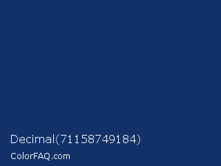 Decimal 71158749184 Color is a dark blue color and the nearest color is Biscay #1b3162. Hex code #113168 and RGB value is rgb(17,49,104). In RGB color space, this color is composed of 7% red, 19% green, 41% blue, In CMYK color space, this color is composed of 84% cyan, 53% magenta, 0% yellow , 59% black , In HSL color space, this color has a hue angle of 218° , 72% saturation and 24% lightness.
