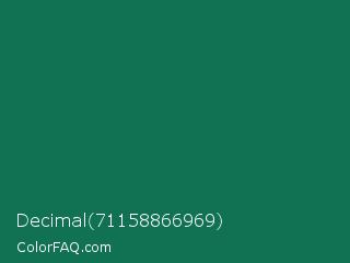 Decimal 71158866969 Color is a dark green color and the nearest color is Watercourse #056f57. Hex code #117253 and RGB value is rgb(17,114,83). In RGB color space, this color is composed of 7% red, 45% green, 33% blue, In CMYK color space, this color is composed of 85% cyan, 0% magenta, 27% yellow , 55% black , In HSL color space, this color has a hue angle of 161° , 74% saturation and 26% lightness.