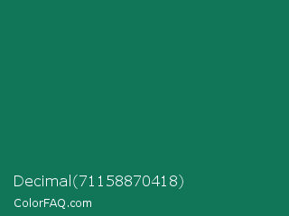 Decimal 71158870418 Color is a dark green color and the nearest color is Deep Green Cyan Turquoise #0e7c61. Hex code #117558 and RGB value is rgb(17,117,88). In RGB color space, this color is composed of 7% red, 46% green, 35% blue, In CMYK color space, this color is composed of 85% cyan, 0% magenta, 25% yellow , 54% black , In HSL color space, this color has a hue angle of 163° , 75% saturation and 26% lightness.