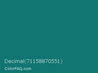 Decimal 71158870551 Color is a dark cyan color and the nearest color is Genoa #15736b. Hex code #117571 and RGB value is rgb(17,117,113). In RGB color space, this color is composed of 7% red, 46% green, 44% blue, In CMYK color space, this color is composed of 85% cyan, 0% magenta, 3% yellow , 54% black , In HSL color space, this color has a hue angle of 178° , 75% saturation and 26% lightness.