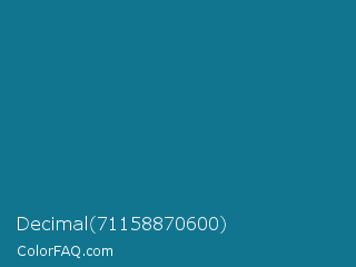 Decimal 71158870600 Color is a normal cyan color and the nearest color is Metallic Seaweed #0a7e8c. Hex code #117590 and RGB value is rgb(17,117,144). In RGB color space, this color is composed of 7% red, 46% green, 56% blue, In CMYK color space, this color is composed of 88% cyan, 19% magenta, 0% yellow , 44% black , In HSL color space, this color has a hue angle of 193° , 79% saturation and 32% lightness.