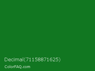 Decimal 71158871625 Color is a dark green color and the nearest color is La Salle Green #087830. Hex code #117721 and RGB value is rgb(17,119,33). In RGB color space, this color is composed of 7% red, 47% green, 13% blue, In CMYK color space, this color is composed of 86% cyan, 0% magenta, 72% yellow , 53% black , In HSL color space, this color has a hue angle of 129° , 75% saturation and 27% lightness.