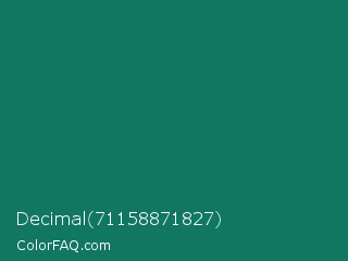 Decimal 71158871827 Color is a dark cyan color and the nearest color is Deep Green Cyan Turquoise #0e7c61. Hex code #117761 and RGB value is rgb(17,119,97). In RGB color space, this color is composed of 7% red, 47% green, 38% blue, In CMYK color space, this color is composed of 86% cyan, 0% magenta, 18% yellow , 53% black , In HSL color space, this color has a hue angle of 167° , 75% saturation and 27% lightness.