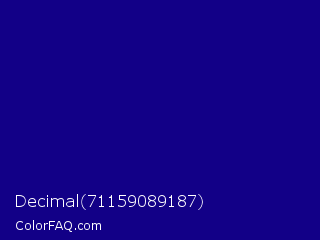 Decimal 71159089187 Color is a dark indigo color and the nearest color is Ultramarine #120a8f. Hex code #120087 and RGB value is rgb(18,0,135). In RGB color space, this color is composed of 7% red, 0% green, 53% blue, In CMYK color space, this color is composed of 87% cyan, 100% magenta, 0% yellow , 47% black , In HSL color space, this color has a hue angle of 248° , 100% saturation and 26% lightness.