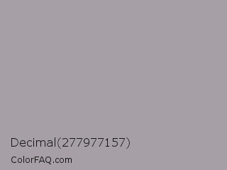 Decimal 277977157 Color is a light magenta color and the nearest color is Quick Silver #a6a6a6. Hex code #a69fa5 and RGB value is rgb(166,159,165). In RGB color space, this color is composed of 65% red, 62% green, 65% blue, In CMYK color space, this color is composed of 0% cyan, 4% magenta, 1% yellow , 35% black , In HSL color space, this color has a hue angle of 309° , 4% saturation and 64% lightness.