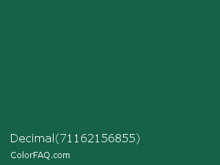 Decimal 71162156855 Color is a dark green color and the nearest color is Green Pea #1d6142. Hex code #166149 and RGB value is rgb(22,97,73). In RGB color space, this color is composed of 9% red, 38% green, 29% blue, In CMYK color space, this color is composed of 77% cyan, 0% magenta, 25% yellow , 62% black , In HSL color space, this color has a hue angle of 161° , 63% saturation and 23% lightness.