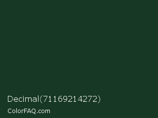 Decimal 71169214272 Color is a very dark green color and the nearest color is Phthalo Green #123524. Hex code #173824 and RGB value is rgb(23,56,36). In RGB color space, this color is composed of 9% red, 22% green, 14% blue, In CMYK color space, this color is composed of 59% cyan, 0% magenta, 36% yellow , 78% black , In HSL color space, this color has a hue angle of 144° , 42% saturation and 15% lightness.