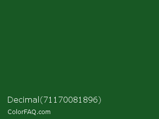 Decimal 71170081896 Color is a very dark green color and the nearest color is Cal Poly Pomona Green #1e4d2b. Hex code #185824 and RGB value is rgb(24,88,36). In RGB color space, this color is composed of 9% red, 35% green, 14% blue, In CMYK color space, this color is composed of 73% cyan, 0% magenta, 59% yellow , 65% black , In HSL color space, this color has a hue angle of 131° , 57% saturation and 22% lightness.