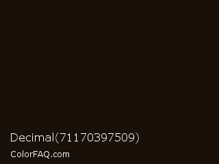 Decimal 71170397509 Color is a almost black orange color and the nearest color is Crowshead #1c1208. Hex code #191009 and RGB value is rgb(25,16,9). In RGB color space, this color is composed of 10% red, 6% green, 4% blue, In CMYK color space, this color is composed of 0% cyan, 36% magenta, 64% yellow , 90% black , In HSL color space, this color has a hue angle of 26° , 47% saturation and 7% lightness.