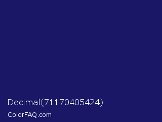 Decimal 71170405424 Color is a dark indigo color and the nearest color is Lucky Point #1a1a68. Hex code #191766 and RGB value is rgb(25,23,102). In RGB color space, this color is composed of 10% red, 9% green, 40% blue, In CMYK color space, this color is composed of 75% cyan, 77% magenta, 0% yellow , 60% black , In HSL color space, this color has a hue angle of 242° , 63% saturation and 25% lightness.