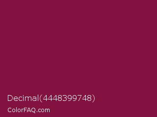 Decimal 4448399748 Color is a dark rose color and the nearest color is Rose Bud Cherry #800b47. Hex code #831240 and RGB value is rgb(131,18,64). In RGB color space, this color is composed of 51% red, 7% green, 25% blue, In CMYK color space, this color is composed of 0% cyan, 86% magenta, 51% yellow , 49% black , In HSL color space, this color has a hue angle of 336° , 76% saturation and 29% lightness.