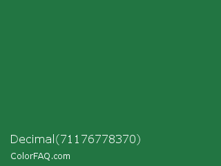 Decimal 71176778370 Color is a dark green color and the nearest color is Dark Spring Green #177245. Hex code #227542 and RGB value is rgb(34,117,66). In RGB color space, this color is composed of 13% red, 46% green, 26% blue, In CMYK color space, this color is composed of 71% cyan, 0% magenta, 44% yellow , 54% black , In HSL color space, this color has a hue angle of 143° , 55% saturation and 30% lightness.