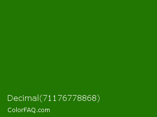 Decimal 71176778868 Color is a dark green color and the nearest color is Napier Green #2a8000. Hex code #227602 and RGB value is rgb(34,118,2). In RGB color space, this color is composed of 13% red, 46% green, 1% blue, In CMYK color space, this color is composed of 71% cyan, 0% magenta, 98% yellow , 54% black , In HSL color space, this color has a hue angle of 103° , 97% saturation and 24% lightness.