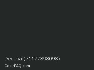 Decimal 71177898098 Color is a very dark cyan color and the nearest color is Charleston Green #232b2b. Hex code #242928 and RGB value is rgb(36,41,40). In RGB color space, this color is composed of 14% red, 16% green, 16% blue, In CMYK color space, this color is composed of 12% cyan, 0% magenta, 2% yellow , 84% black , In HSL color space, this color has a hue angle of 168° , 6% saturation and 15% lightness.