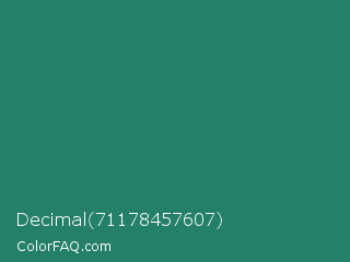 Decimal 71178457607 Color is a normal cyan color and the nearest color is Eucalyptus #278a5b. Hex code #248067 and RGB value is rgb(36,128,103). In RGB color space, this color is composed of 14% red, 50% green, 40% blue, In CMYK color space, this color is composed of 72% cyan, 0% magenta, 20% yellow , 50% black , In HSL color space, this color has a hue angle of 164° , 56% saturation and 32% lightness.