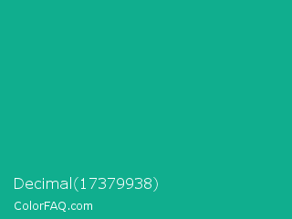 Decimal 17379938 Color is a normal cyan color and the nearest color is Mountain Meadow Crayola #1ab385. Hex code #10ae8e and RGB value is rgb(16,174,142). In RGB color space, this color is composed of 6% red, 68% green, 56% blue, In CMYK color space, this color is composed of 91% cyan, 0% magenta, 18% yellow , 32% black , In HSL color space, this color has a hue angle of 168° , 83% saturation and 37% lightness.