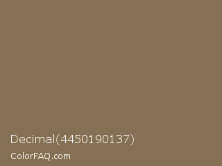 Decimal 4450190137 Color is a normal orange color and the nearest color is Shadow Crayola #837050. Hex code #857053 and RGB value is rgb(133,112,83). In RGB color space, this color is composed of 52% red, 44% green, 33% blue, In CMYK color space, this color is composed of 0% cyan, 16% magenta, 38% yellow , 48% black , In HSL color space, this color has a hue angle of 35° , 23% saturation and 42% lightness.