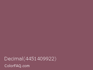 Decimal 4451409922 Color is a normal rose color and the nearest color is Twilight Lavender #8a496b. Hex code #875362 and RGB value is rgb(135,83,98). In RGB color space, this color is composed of 53% red, 33% green, 38% blue, In CMYK color space, this color is composed of 0% cyan, 39% magenta, 27% yellow , 47% black , In HSL color space, this color has a hue angle of 343° , 24% saturation and 43% lightness.
