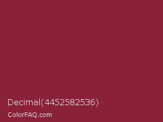 Decimal 4452582536 Color is a normal red color and the nearest color is Antique Ruby #841b2d. Hex code #892238 and RGB value is rgb(137,34,56). In RGB color space, this color is composed of 54% red, 13% green, 22% blue, In CMYK color space, this color is composed of 0% cyan, 75% magenta, 59% yellow , 46% black , In HSL color space, this color has a hue angle of 347° , 60% saturation and 34% lightness.
