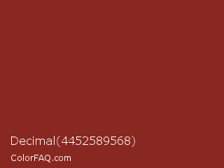 Decimal 4452589568 Color is a normal red color and the nearest color is Vivid Auburn #922724. Hex code #892820 and RGB value is rgb(137,40,32). In RGB color space, this color is composed of 54% red, 16% green, 13% blue, In CMYK color space, this color is composed of 0% cyan, 71% magenta, 77% yellow , 46% black , In HSL color space, this color has a hue angle of 5° , 62% saturation and 33% lightness.