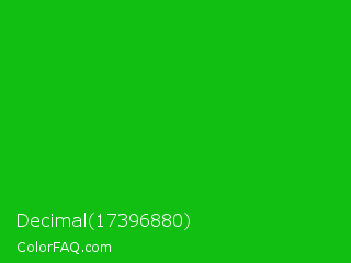Decimal 17396880 Color is a normal green color and the nearest color is Vivid Malachite #00cc33. Hex code #10bf12 and RGB value is rgb(16,191,18). In RGB color space, this color is composed of 6% red, 75% green, 7% blue, In CMYK color space, this color is composed of 92% cyan, 0% magenta, 91% yellow , 25% black , In HSL color space, this color has a hue angle of 121° , 85% saturation and 41% lightness.