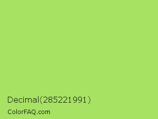 Decimal 285221991 Color is a light green color and the nearest color is Inchworm #b2ec5d. Hex code #a7e263 and RGB value is rgb(167,226,99). In RGB color space, this color is composed of 65% red, 89% green, 39% blue, In CMYK color space, this color is composed of 26% cyan, 0% magenta, 56% yellow , 11% black , In HSL color space, this color has a hue angle of 88° , 69% saturation and 64% lightness.