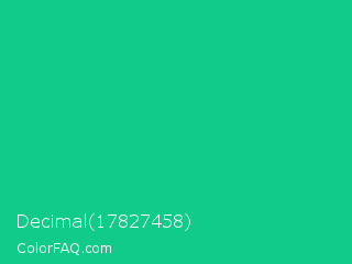 Decimal 17827458 Color is a normal green color and the nearest color is Caribbean Green #00cc99. Hex code #10cb8a and RGB value is rgb(16,203,138). In RGB color space, this color is composed of 6% red, 80% green, 54% blue, In CMYK color space, this color is composed of 92% cyan, 0% magenta, 32% yellow , 20% black , In HSL color space, this color has a hue angle of 159° , 85% saturation and 43% lightness.