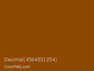 Decimal 4564551254 Color is a dark orange color and the nearest color is Brown #964b00. Hex code #904700 and RGB value is rgb(144,71,0). In RGB color space, this color is composed of 56% red, 28% green, 0% blue, In CMYK color space, this color is composed of 0% cyan, 51% magenta, 100% yellow , 44% black , In HSL color space, this color has a hue angle of 30° , 100% saturation and 28% lightness.