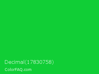 Decimal 17830758 Color is a normal green color and the nearest color is Vivid Malachite #00cc33. Hex code #10ce36 and RGB value is rgb(16,206,54). In RGB color space, this color is composed of 6% red, 81% green, 21% blue, In CMYK color space, this color is composed of 92% cyan, 0% magenta, 74% yellow , 19% black , In HSL color space, this color has a hue angle of 132° , 86% saturation and 44% lightness.