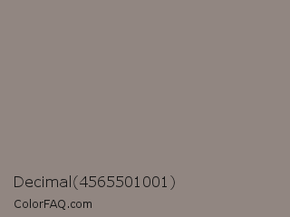 Decimal 4565501001 Color is a normal orange color and the nearest color is Natural Gray #8b8680. Hex code #918681 and RGB value is rgb(145,134,129). In RGB color space, this color is composed of 57% red, 53% green, 51% blue, In CMYK color space, this color is composed of 0% cyan, 8% magenta, 11% yellow , 43% black , In HSL color space, this color has a hue angle of 19° , 7% saturation and 54% lightness.