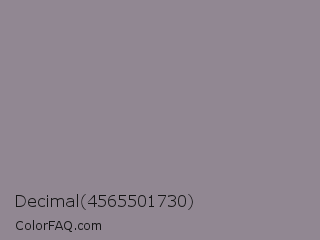 Decimal 4565501730 Color is a normal magenta color and the nearest color is Venus #928590. Hex code #918792 and RGB value is rgb(145,135,146). In RGB color space, this color is composed of 57% red, 53% green, 57% blue, In CMYK color space, this color is composed of 1% cyan, 8% magenta, 0% yellow , 43% black , In HSL color space, this color has a hue angle of 295° , 5% saturation and 55% lightness.