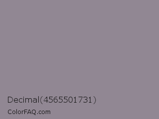 Decimal 4565501731 Color is a normal purple color and the nearest color is Venus #928590. Hex code #918793 and RGB value is rgb(145,135,147). In RGB color space, this color is composed of 57% red, 53% green, 58% blue, In CMYK color space, this color is composed of 1% cyan, 8% magenta, 0% yellow , 42% black , In HSL color space, this color has a hue angle of 290° , 5% saturation and 55% lightness.
