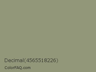 Decimal 4565518226 Color is a normal lime color and the nearest color is Artichoke #8f9779. Hex code #919778 and RGB value is rgb(145,151,120). In RGB color space, this color is composed of 57% red, 59% green, 47% blue, In CMYK color space, this color is composed of 4% cyan, 0% magenta, 21% yellow , 41% black , In HSL color space, this color has a hue angle of 72° , 13% saturation and 53% lightness.