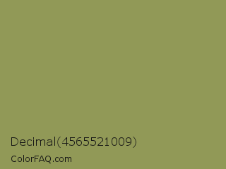 Decimal 4565521009 Color is a normal yellow color and the nearest color is Moss Green #8a9a5b. Hex code #919957 and RGB value is rgb(145,153,87). In RGB color space, this color is composed of 57% red, 60% green, 34% blue, In CMYK color space, this color is composed of 5% cyan, 0% magenta, 43% yellow , 40% black , In HSL color space, this color has a hue angle of 67° , 28% saturation and 47% lightness.