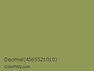 Decimal 4565521010 Color is a normal yellow color and the nearest color is Moss Green #8a9a5b. Hex code #919958 and RGB value is rgb(145,153,88). In RGB color space, this color is composed of 57% red, 60% green, 35% blue, In CMYK color space, this color is composed of 5% cyan, 0% magenta, 42% yellow , 40% black , In HSL color space, this color has a hue angle of 67° , 27% saturation and 47% lightness.