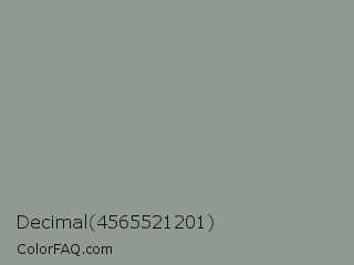 Decimal 4565521201 Color is a normal green color and the nearest color is Mantle #8b9c90. Hex code #919993 and RGB value is rgb(145,153,147). In RGB color space, this color is composed of 57% red, 60% green, 58% blue, In CMYK color space, this color is composed of 5% cyan, 0% magenta, 4% yellow , 40% black , In HSL color space, this color has a hue angle of 135° , 4% saturation and 58% lightness.