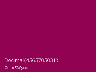 Decimal 4565705031 Color is a dark magenta color and the nearest color is Cardinal Pink #8c055e. Hex code #920253 and RGB value is rgb(146,2,83). In RGB color space, this color is composed of 57% red, 1% green, 33% blue, In CMYK color space, this color is composed of 0% cyan, 99% magenta, 43% yellow , 43% black , In HSL color space, this color has a hue angle of 326° , 97% saturation and 29% lightness.