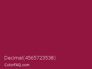 Decimal 4565723538 Color is a normal rose color and the nearest color is Vivid Burgundy #9f1d35. Hex code #921540 and RGB value is rgb(146,21,64). In RGB color space, this color is composed of 57% red, 8% green, 25% blue, In CMYK color space, this color is composed of 0% cyan, 86% magenta, 56% yellow , 43% black , In HSL color space, this color has a hue angle of 339° , 75% saturation and 33% lightness.