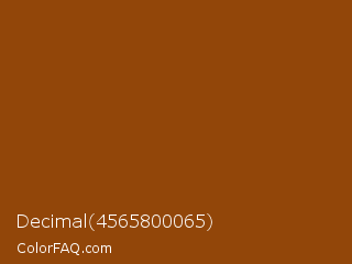 Decimal 4565800065 Color is a dark orange color and the nearest color is Korma #8f4b0e. Hex code #924609 and RGB value is rgb(146,70,9). In RGB color space, this color is composed of 57% red, 27% green, 4% blue, In CMYK color space, this color is composed of 0% cyan, 52% magenta, 94% yellow , 43% black , In HSL color space, this color has a hue angle of 27° , 88% saturation and 30% lightness.