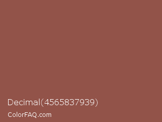 Decimal 4565837939 Color is a normal red color and the nearest color is Spicy Mix #885342. Hex code #925349 and RGB value is rgb(146,83,73). In RGB color space, this color is composed of 57% red, 33% green, 29% blue, In CMYK color space, this color is composed of 0% cyan, 43% magenta, 50% yellow , 43% black , In HSL color space, this color has a hue angle of 8° , 33% saturation and 43% lightness.