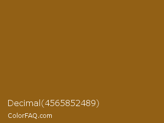 Decimal 4565852489 Color is a normal orange color and the nearest color is Golden Brown #996515. Hex code #926015 and RGB value is rgb(146,96,21). In RGB color space, this color is composed of 57% red, 38% green, 8% blue, In CMYK color space, this color is composed of 0% cyan, 34% magenta, 86% yellow , 43% black , In HSL color space, this color has a hue angle of 36° , 75% saturation and 33% lightness.